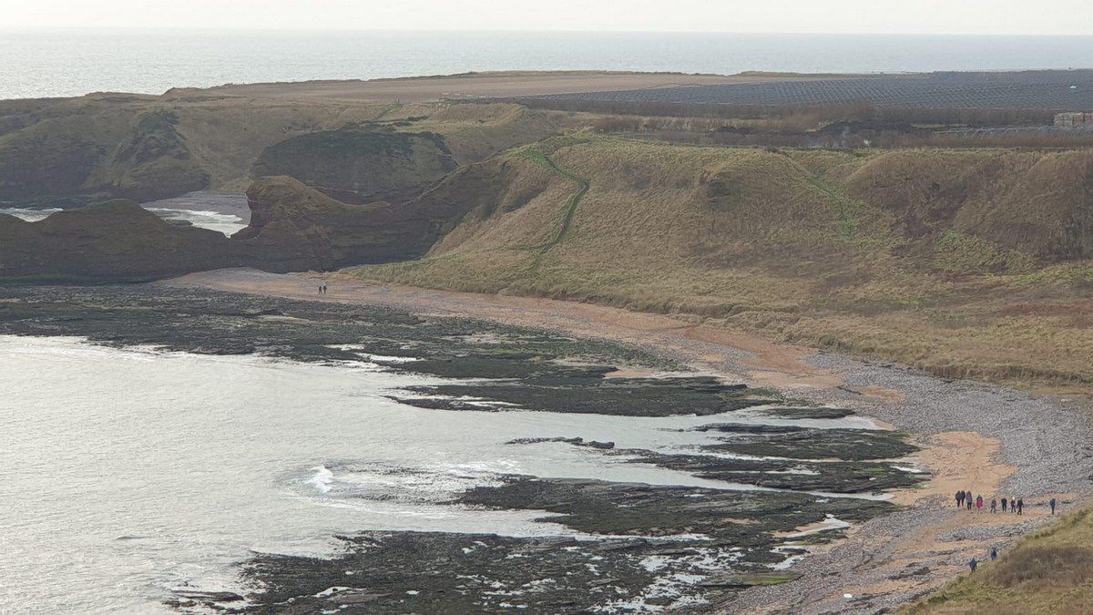 Due to instability of the cliff face at Seaton Den, the group descended a flight of irregular steps to the pebble beach before puffing their way up back up a longer flight at the North end!! Their reward was some beautiful views looking back towards the Flairs. At the top of the steps to the Flairs there was a metal installation of musical notation which represented “The Lord of the Dance”.